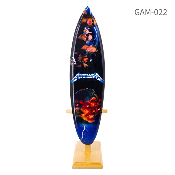 בתמונה מופיע גלשן סרף בגודל 25CM בצבע כחול-שחור מעוצב באמנות גרפית אפלה ודינמית בהשראת להקת מטאליקה (Metallica). בחלק העליון – תמונה קבוצתית של ארבעת חברי הלהקה (ג'יימס הטפילד, לארס אולריך, קירק המט ורוב טרוחילו) עם שיער ארוך, לבושים בחולצות שחורות, בפוזת הדבanging (זריקת ראש) אינטנסיבית, מוקפים בברקים כחולים. במרכז – הלוגו האיקוני של הלהקה: "METALLICA" באותיות כחולות גדולות ומעוקלות. בחלק התחתון – דיוקן מפחיד של גולגולת דם (המסכה האגדית מהאלבום Master of Puppets), עם עיניים אדומות בוערות, שיער אש מתפרץ ופה פתוח חושף שיניים, על רקע להבות אש וברקים כחולים.
